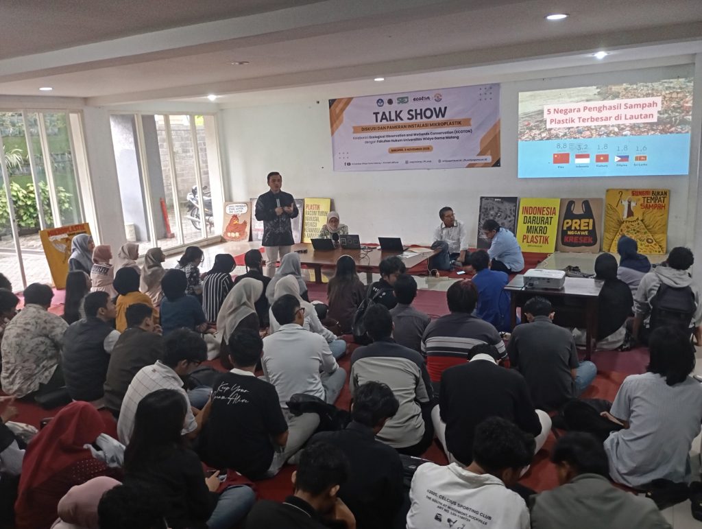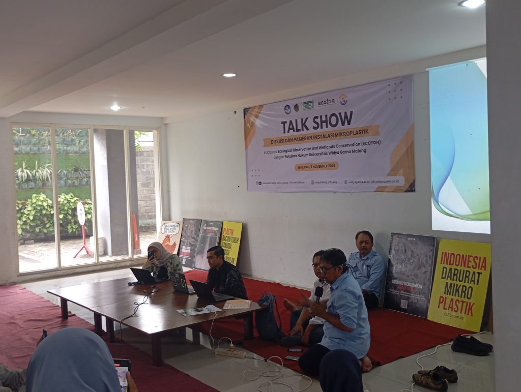 UWG Malang, 5 November 2025 – Fakultas Hukum Universitas Widya Gama (UWG) Malang menunjukkan komitmennya terhadap isu lingkungan dengan menyelenggarakan Talk Show bertajuk “Membangun Kesadaran Hukum Lewat Bencana Mikroplastik”, di Lobi Lantai 1 Kampus 2 UWG Malang. Kegiatan ini merupakan kolaborasi antara FH UWG, ECoton, dan Society of Indonesian Environmental Journalists (SIEJ), serta dihadiri oleh mahasiswa lintas fakultas dan pemerhati lingkungan.
