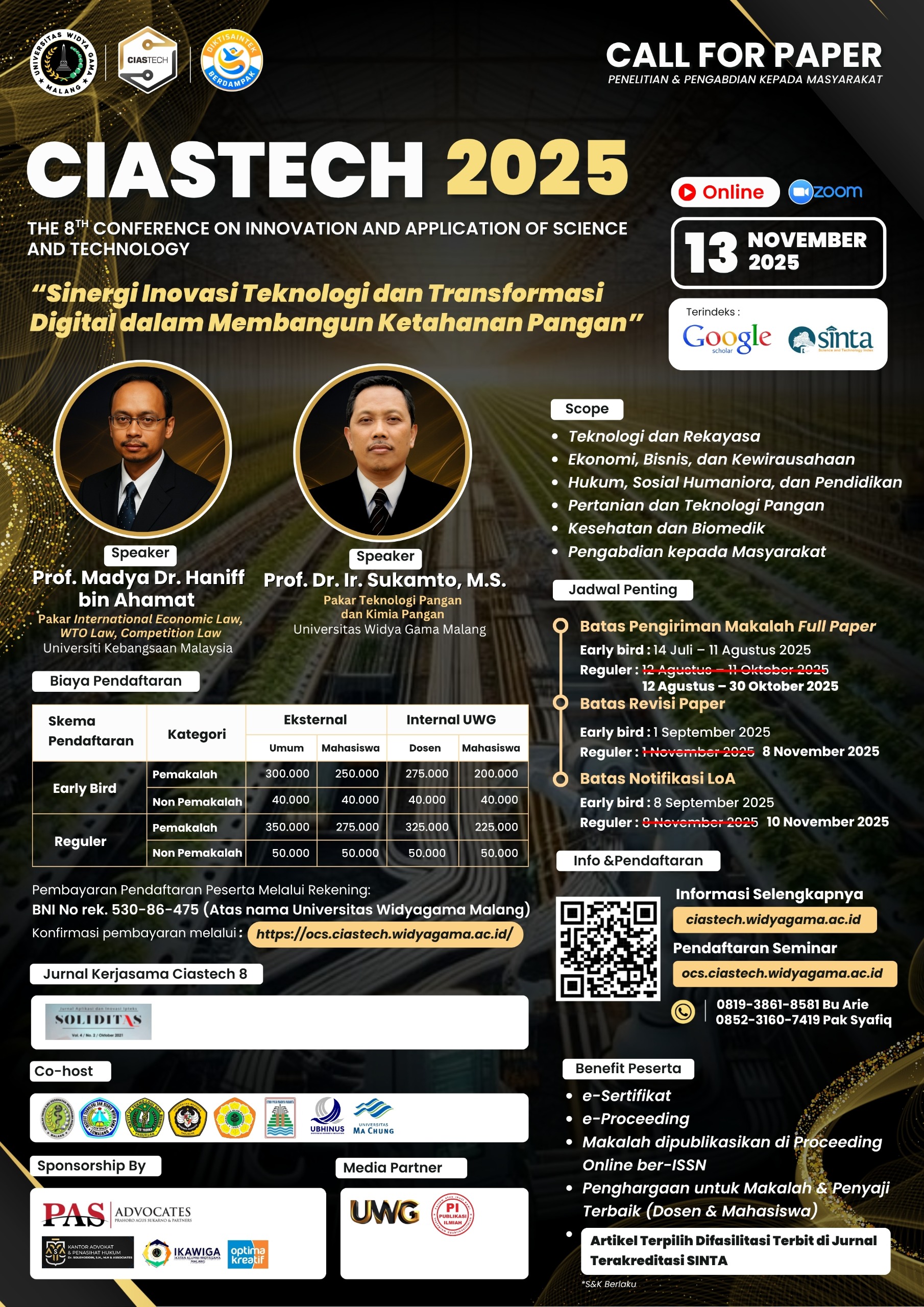 CIASTECH 2025 juga membuka ruang publikasi ilmiah bagi para akademisi, peneliti, dan mahasiswa, dengan cakupan bidang teknologi rekayasa, ekonomi, hukum, sosial humaniora, pertanian, kesehatan, dan pengabdian masyarakat. Artikel terpilih akan difasilitasi untuk diterbitkan di jurnal terindeks SINTA dan Google Scholar.